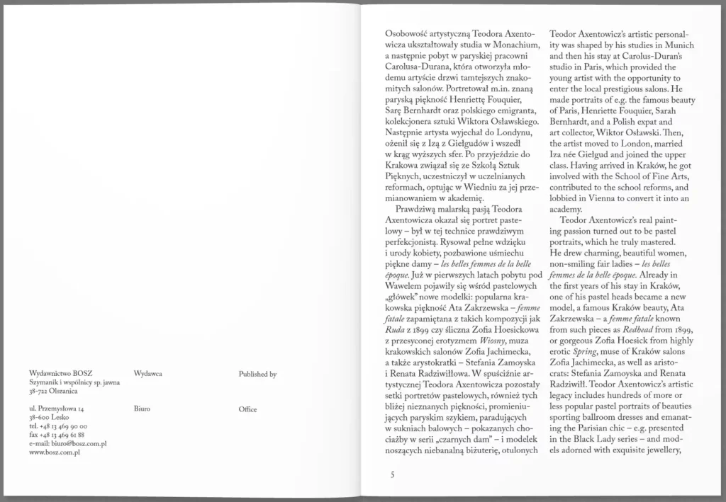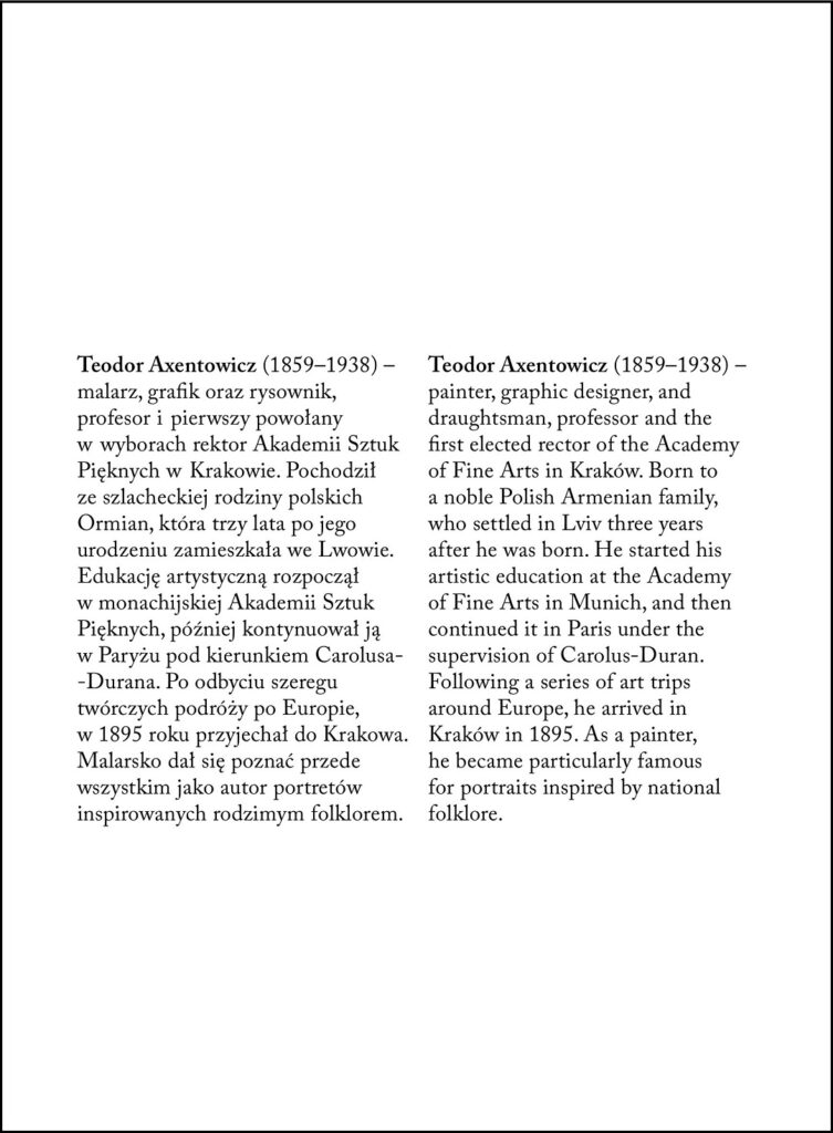 Teodor Axentowicz (1859–1938) – malarz, grafik oraz rysownik, profesor i pierwszy powołany w wyborach rektor Akademii Sztuk Pięknych w Krakowie. Pochodził ze szlacheckiej rodziny polskich Ormian, która trzy lata po jego urodzeniu zamieszkała we Lwowie. Edukację artystyczną rozpoczął w monachijskiej Akademii Sztuk Pięknych, później kontynuował ją w Paryżu pod kierunkiem Carolusa-Durana. Po odbyciu szeregu twórczych podróży po Europie w 1895 roku przyjechał do Krakowa. Malarsko dał się poznać przede wszystkim jako autor portretów inspirowanych rodzimym folklorem. Album, opatrzony wstępem dr Stefani Krzysztofowicz-Kozakowskiej, prezentuje najważniejsze dzieła artysty.