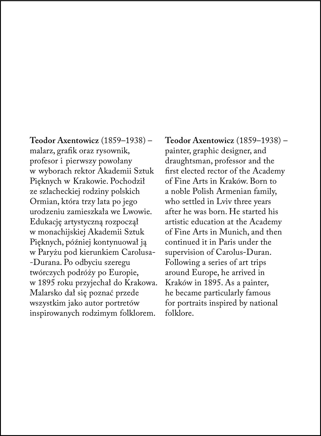 Teodor Axentowicz (1859–1938) – malarz, grafik oraz rysownik, profesor i pierwszy powołany w wyborach rektor Akademii Sztuk Pięknych w Krakowie. Pochodził ze szlacheckiej rodziny polskich Ormian, która trzy lata po jego urodzeniu zamieszkała we Lwowie. Edukację artystyczną rozpoczął w monachijskiej Akademii Sztuk Pięknych, później kontynuował ją w Paryżu pod kierunkiem Carolusa-Durana. Po odbyciu szeregu twórczych podróży po Europie w 1895 roku przyjechał do Krakowa. Malarsko dał się poznać przede wszystkim jako autor portretów inspirowanych rodzimym folklorem. Album, opatrzony wstępem dr Stefani Krzysztofowicz-Kozakowskiej, prezentuje najważniejsze dzieła artysty.