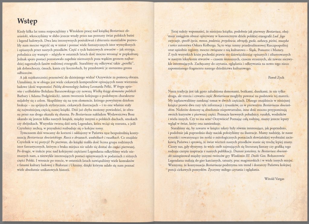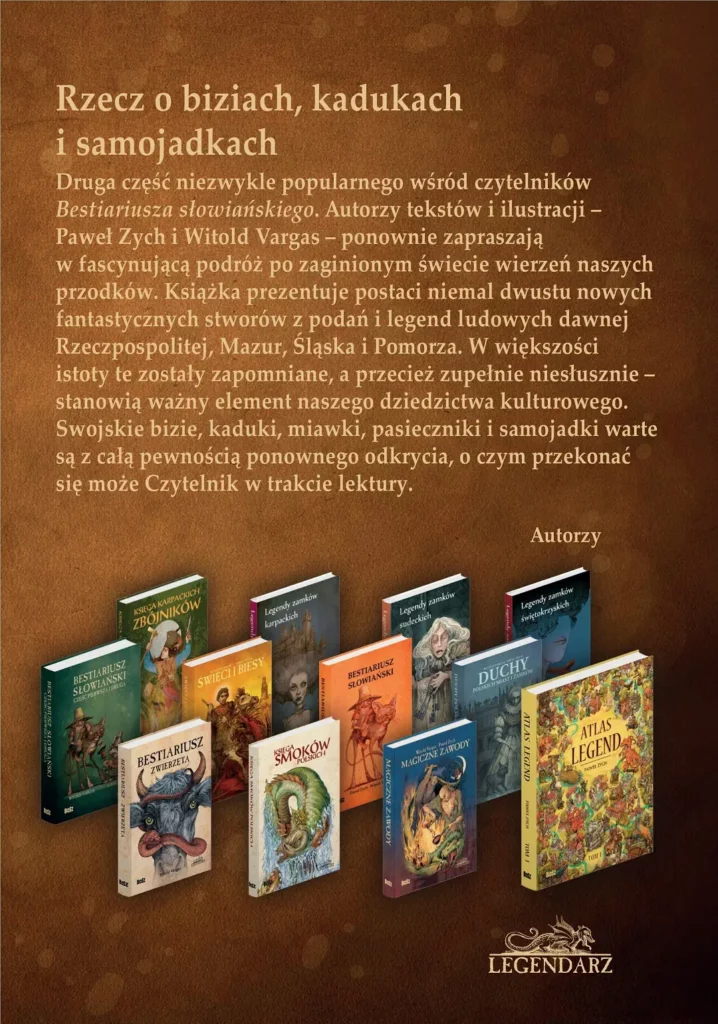 Druga część znakomitego i niezwykle popularnego wśród czytelników „Bestiariusza słowiańskiego”. Autorzy i ilustratorzy: Paweł Zych i Witold Vargas zapraszają tym razem do poznania rzadko przywoływanych w literaturze fantastycznych opowieści i legendarnych stworów, m.in.: bizi, kaduków czy samojadków. Znajdziemy w nim historie zarówno rodzimych istot – z terenów przedrozbiorowej Polski, Mazur, Śląska i Pomorza, jak i bohaterów opisywanych w podaniach i legendach kultury ludowej Białorusi i Ukrainy. Blisko sto dziewięćdziesiąt opisanych i pięknie zilustrowanych – czasem śmiesznych, czasem strasznych, ale zawsze niezwykle interesujących postaci można oglądać na kartach „Bestiariusza 2”, odkrywając na nowo ten nieco zapomniany fragment naszego dziedzictwa kulturowego.