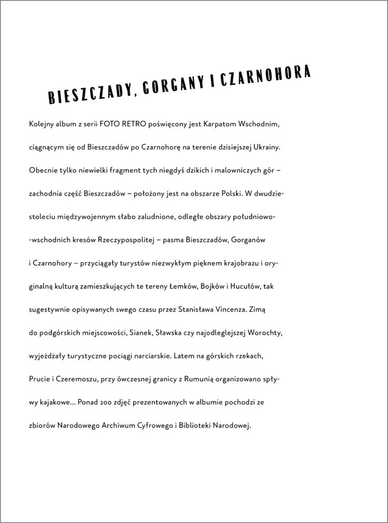 Tematem kolejnego albumu z serii FOTO RETRO jest piękno górskiej przyrody, a dokładniej polskich Bieszczadów i ukraińskiej Czarnohory, ukazane w kadrze wyjątkowych zdjęć z kolekcji Narodowego Archiwum Cyfrowego. Dzięki tym unikalnym fotografiom możemy zaobserwować, jak na przestrzeni lat zmieniał się urokliwy krajobraz wokół Tarnicy, Wielkiej Rawki czy Howerli.