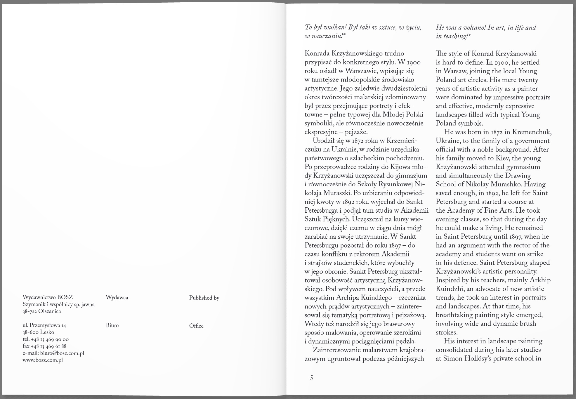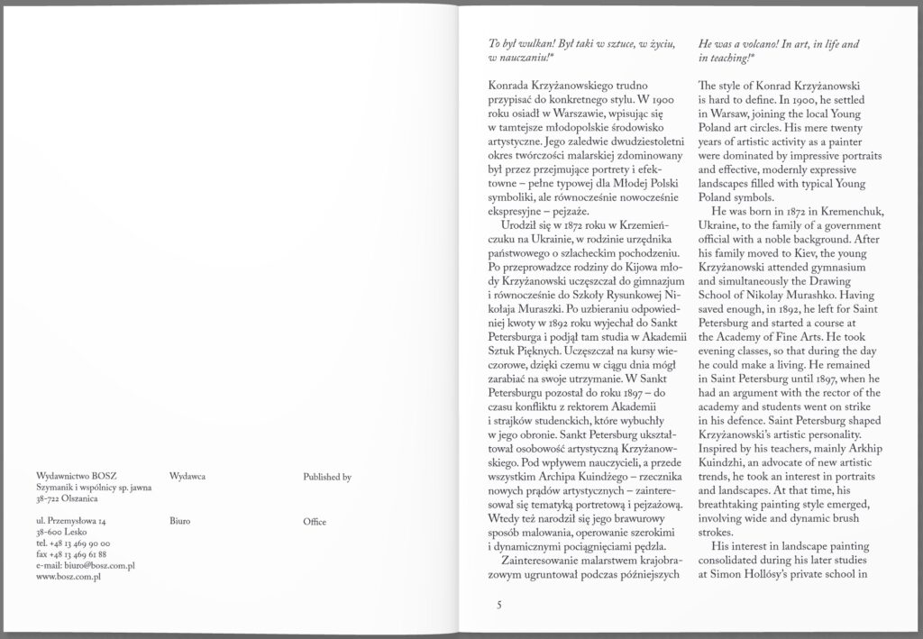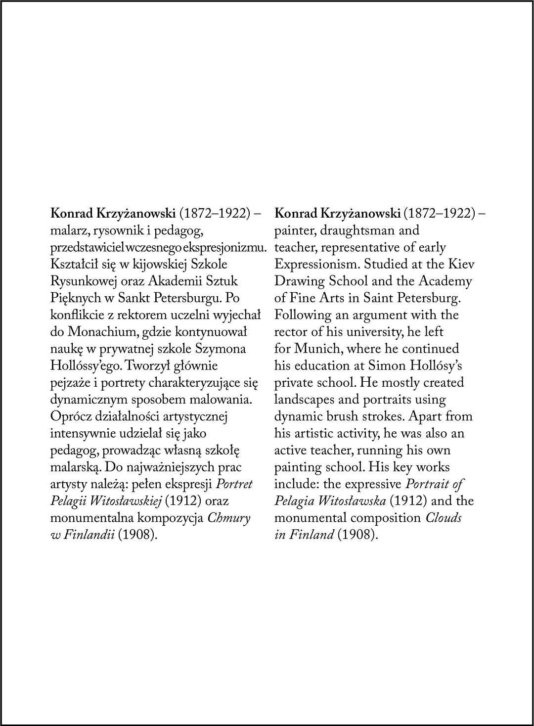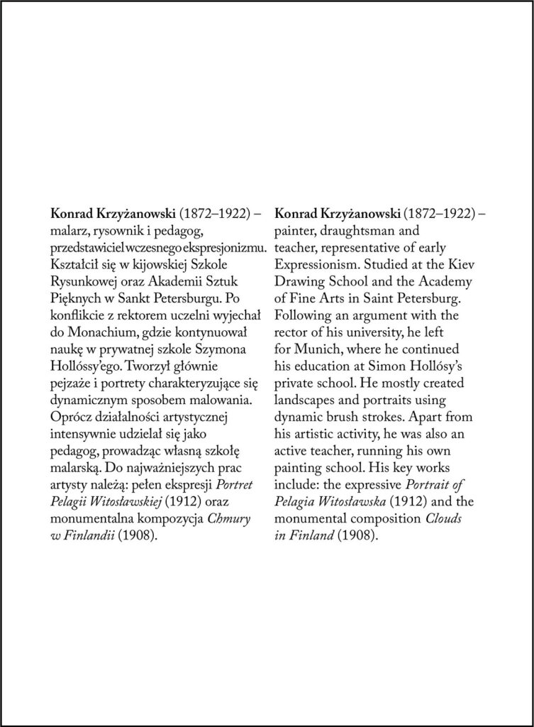 Album prezentujący dorobek malarza i rysownika Konrada Krzyżanowskiego (1872–1922). Studiował w Akademii Sztuk Pięknych w Petersburgu, gdzie zainteresował się malarstwem portretowym i pejzażowym, tam też zaczął rozwijać swój charakterystyczny, dynamiczny styl. Kiedy po późniejszym pobycie w Monachium Krzyżanowski przyjechał do Warszawy, rozpoczął wówczas najbardziej intensywny okres swojej twórczości. Jego efektem były dzieła pełne ekspresji, o intrygującej kolorystyce, takie jak m.in. „Portret Marii Krzymuskiej”, „Chmury w Finlandii” czy „Portret Pelagii Witosławskiej”.