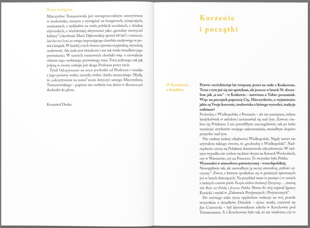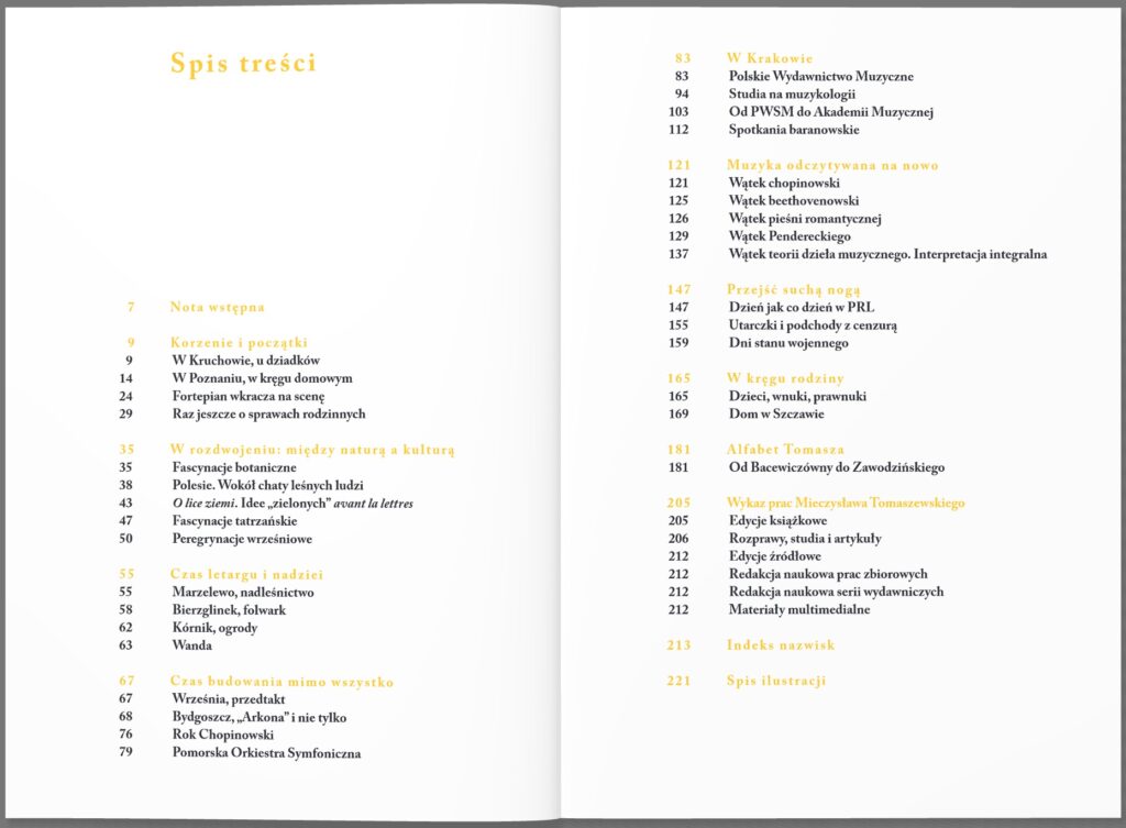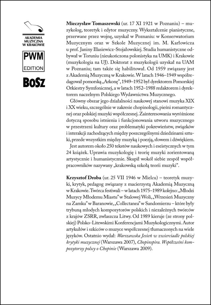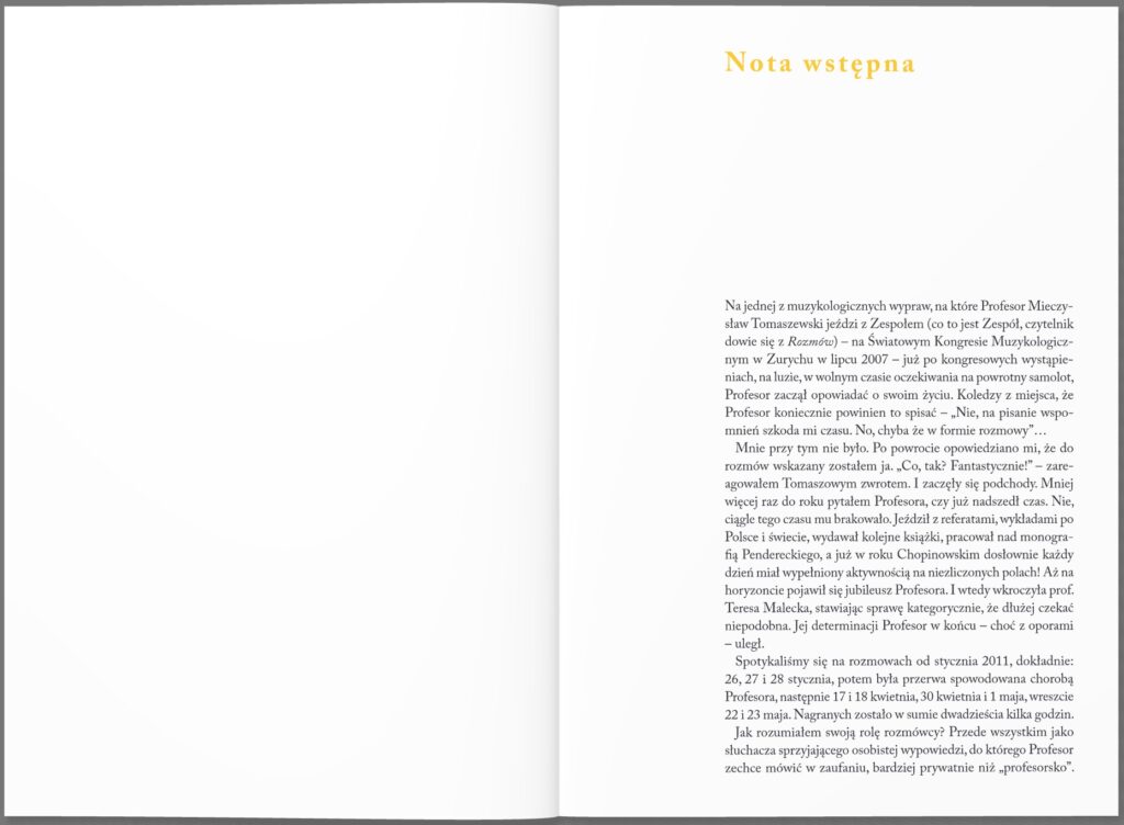 Książka jest wywiadem z Mieczysławem Tomaszewskim – muzykologiem, znawcą twórczości Fryderyka Chopina i edytorem muzycznym. Prof. Tomaszewski jest autorem ponad dwieście pięćdziesiąt tekstów naukowych, dotyczących między innymi pieśni romantycznej, chopinologii czy polskiej muzyki współczesnej. W książce wspomina zarówno swoje dzieciństwo, jak i czas nauki, pracy, sukcesów, współpracowników i znanych artystów. Uzupełnieniem wywiadu jest wykaz prac profesora.