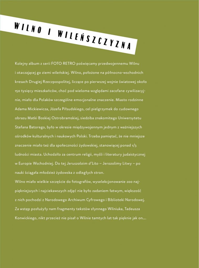 Tematem kolejnego albumu z serii FOTO RETRO jest Wilno – stolica oraz główny ośrodek kulturalny Litwy. To także miejsce ważne dla Polaków, których z Litwinami przez długi czas łączyła wspólna, choć niekiedy burzliwa przeszłość. Swoją siedzibę po dziś dzień mają tam m.in. Związek Polaków na Litwie, Związek Harcerstwa Polskiego, a także polski teatr oraz uniwersytet. Album „Wilno i Wileńszczyzna w starej fotografii” jest zbiorem starannie wybranych, archiwalnych zdjęć, przedstawiających najważniejsze i najpiękniejsze zakątki tego miasta.